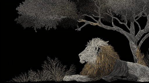 WonderMuralThis mural wallpaper showcases a majestic lion, brilliantly illustrated with delicate lines, resting peacefully at the foot of a stylized tree. The...