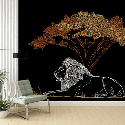 WonderMuralThis magnificent mural wallpaper showcases a majestic lion peacefully lying against a black background, truly captivating. The golden tree that loo...