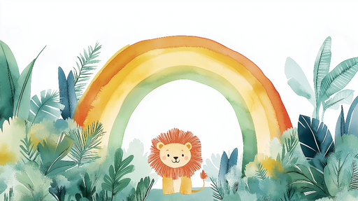 WonderMuralOur mural wallpaper features an adorable lion stylized joyfully standing under a vibrant rainbow, surrounded by lush tropical vegetation. The soft ...