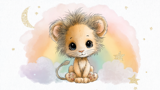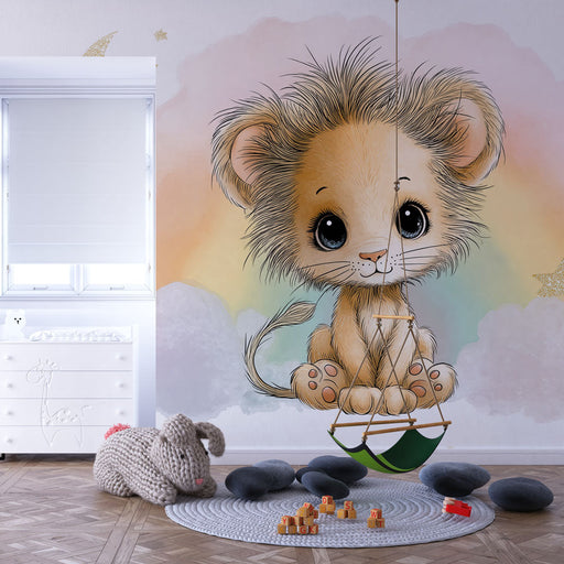 WonderMuralOur exclusive Mural Wallpaper shows you a cute lion cub with big expressive eyes, sitting among soft clouds and a pastel rainbow. The charming illu...