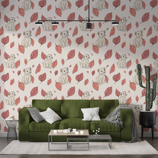 This mural wallpaper features an adorable illustration of a smiling lion, surrounded by delicate leaves. The soft colors and playful design bring a warm and joyful atmosphere to any room.