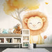 This mural wallpaper features a charming lion cub, with soft and smiling features, set in a natural setting. The background is adorned with a tree with golden leaves and delicate vegetation, creating a warm and soothing atmosphere. The pastel shades, ranging from yellows to soft greens, bring a touch of brightness and cheerfulness to the whole.