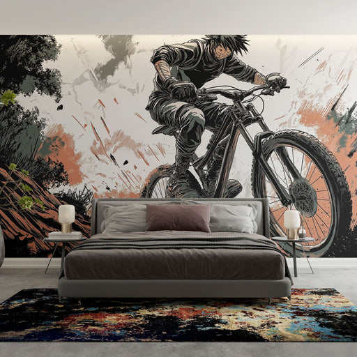 WonderMuralThis captivating mural wallpaper features a mountain cyclist speeding through rugged terrain. The energetic graphic style and vivid colors evoke a ...