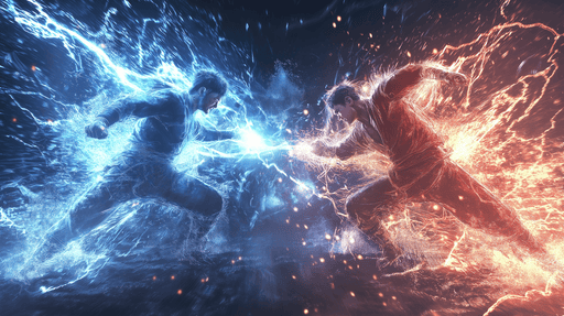 WonderMuralThis striking mural wallpaper features an epic battle between two characters, one emitting a blue energy reminiscent of water, while the other exud...