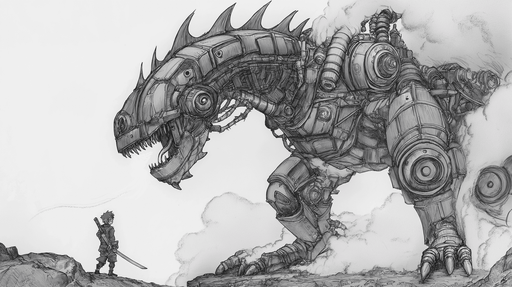 WonderMuralDiscover our mural wallpaper illustrating a captivating scene of a brave hero facing a mechanical dragon, combining the charm of manga and a futuri...