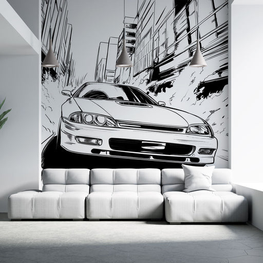 WonderMuralThis captivating poster features a sports car in action, illustrated in a black and white style that emphasizes power and speed. The motion lines c...
