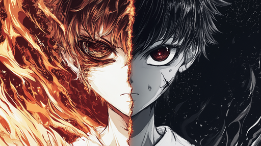 WonderMuralThis striking poster illustrates the concept of the duality of human emotions, depicting a character divided between the intense flame and the myst...