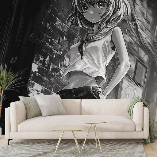 WonderMuralThis captivating mural wallpaper features a manga-style design, illustrating a stylized female character in an urban setting. The shades of black a...