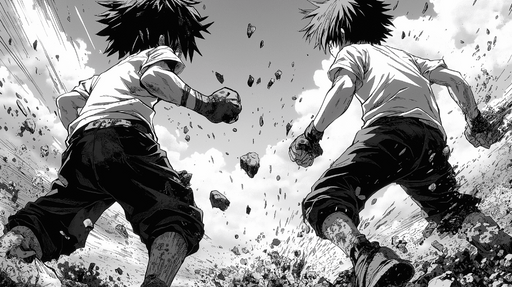 WonderMuralThis captivating mural wallpaper features a intense action scene, where two characters prepare for an epic showdown. The black and white manga styl...