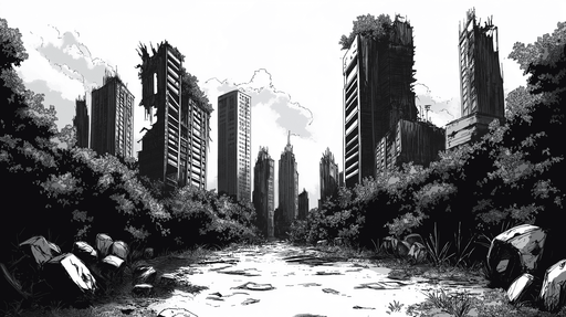 WonderMuralThis captivating mural wallpaper depicts a dystopian urban scene, where large buildings ravaged by time emerge from lush vegetation. The black and ...