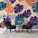 This Tropical Foliage mural wallpaper offers a vibrant and energetic design with monstera and palm leaves in bold patterns. The leaves in purple, orange, blue, and turquoise colors stand out beautifully against a beige background, creating an exotic and refreshing ambiance.