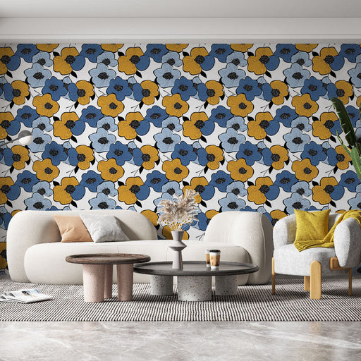 WonderMuralThis wallpaper features a vibrant pattern of blue and yellow-hued flowers, enhanced with dark details that bring dynamism and depth. The bright whi...