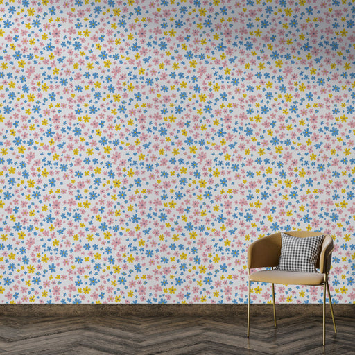 WonderMuralThis shiny wallpaper features a cheerful floral pattern, composed of small yellow, blue, and pink flowers on a light background. The harmonious com...