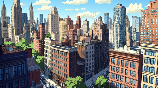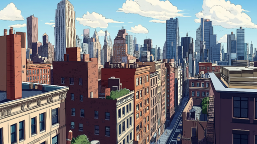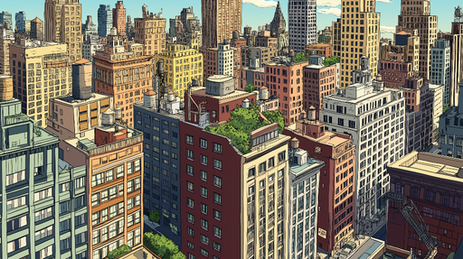 WonderMuralOur mural wallpaper offers a vibrant aerial view of the iconic rooftops of New York, showcasing a warm color palette and unique architectural detai...