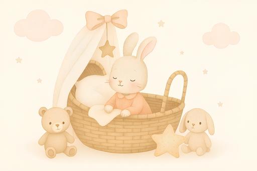 View full detailsMural Wallpaper cute animals | An adorable sleeping rabbit in a basket with soft toys
