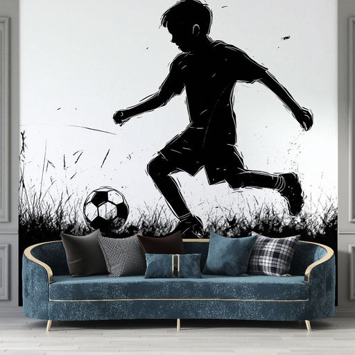 WonderMuralThis unique mural wallpaper highlights the silhouette of a child in action, running with a football. The minimalist and monochrome design evokes th...
