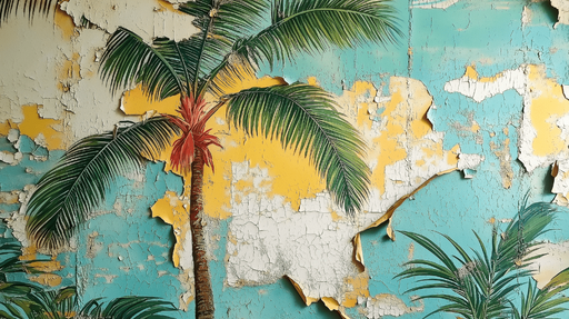 WonderMuralThis captivating mural wallpaper features a vibrant palm tree pattern, incorporating shades of lush green on a worn background with accents of yell...
