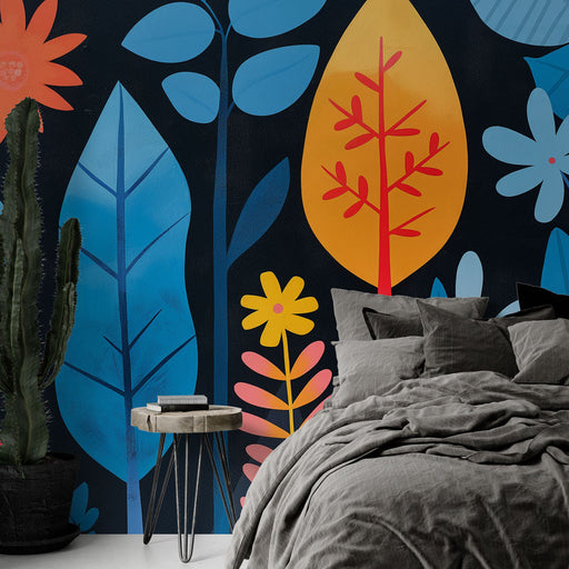 WonderMuralThis vibrant and colorful mural wallpaper, titled Nocturnal Garden, features a captivating design of leaves and flowers in vivid shades on a deep b...