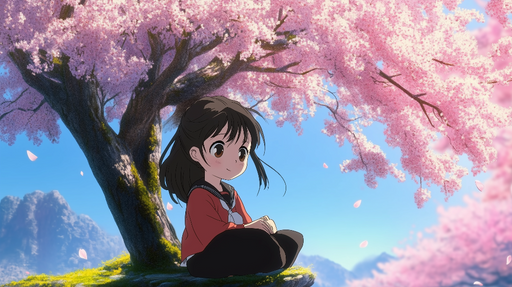 Art'loloThis Sakura animated mural wallpaper captures a serene and delicate scene with a young girl sitting under a magnificent cherry blossom tree. The pi...