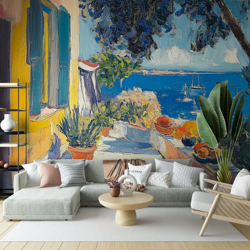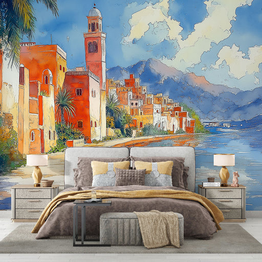 WonderMuralThis mural wallpaper highlights a magnificent online illustration of Mediterranean villas, capturing the essence of coastal landscapes. The geometr...