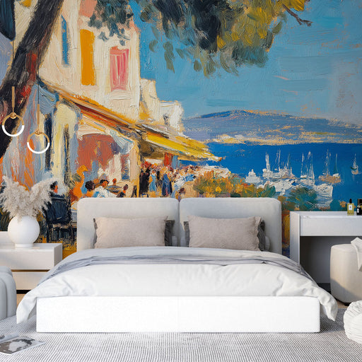WonderMuralOur wallpaper evokes a busy summer beach, where families enjoy the sun and the sea. The white houses overlook the shore, creating a beautiful contr...