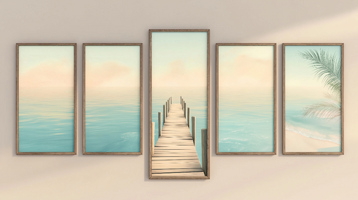 WonderMuralThis mural wallpaper evokes the serenity of the seaside through a series of paintings depicting beaches, waves, and a chic-style cabin. The soft sh...