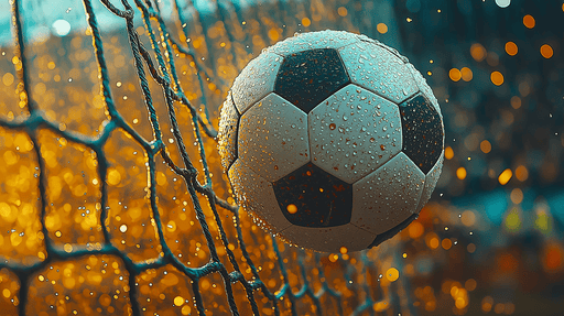This soccer ball captured in full action, illustrating an exciting moment of the game, is adorned with glistening water droplets. The contrast betw...