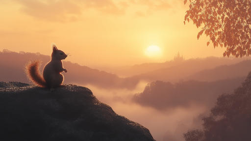 View full detailsMural Wallpaper squirrel at sunset | A contemplative squirrel with a misty landscape and a golden sunset