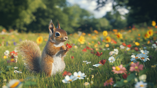 WonderMuralThis mural wallpaper depicts a beloved squirrel, proudly standing in the middle of a bright meadow, adorned with colorful flowers and surrounded by...