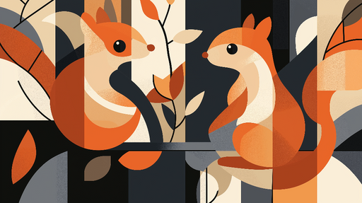 WonderMuralThis unique mural wallpaper features a vibrant graphic design showcasing two charming squirrels. The warm colors of orange, cream, and black intert...