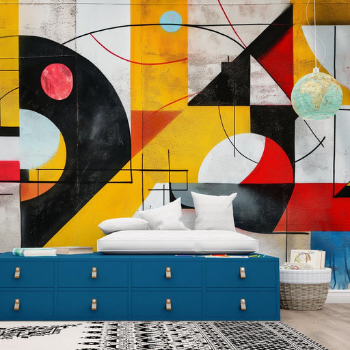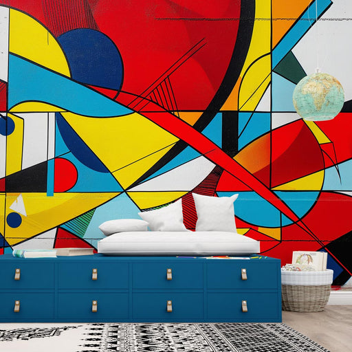 WonderMuralThis mural wallpaper features a dynamic fusion of geometric shapes and bold brushstrokes. With touches of bright red, vibrant yellow, and intense b...