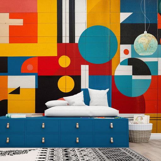 WonderMuralThis Modern Geometric Art mural wallpaper is a true masterpiece of shapes and colors. Circles, rectangles, and lines harmoniously intersect in vibr...