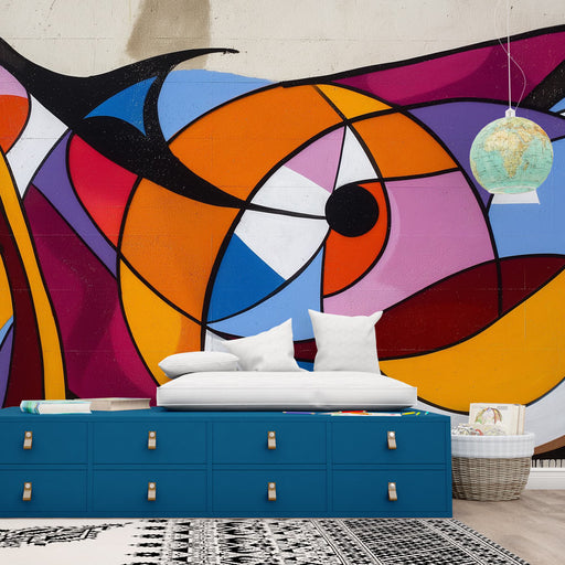 WonderMuralThis mural wallpaper features an explosion of geometric shapes and vivid colors that immediately captivate the eye. The dynamic curves and bold lin...