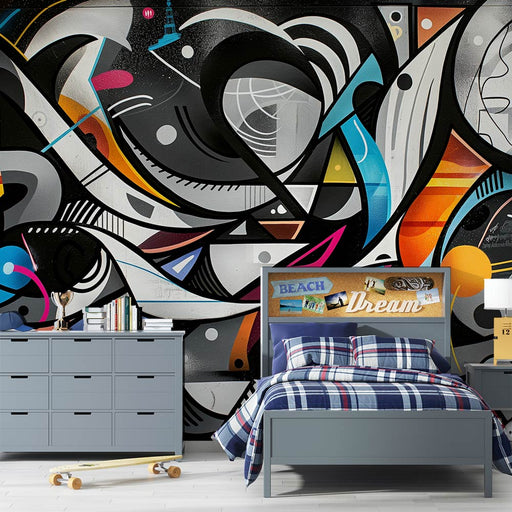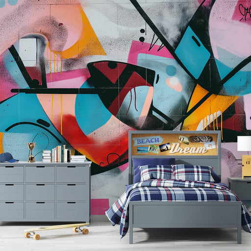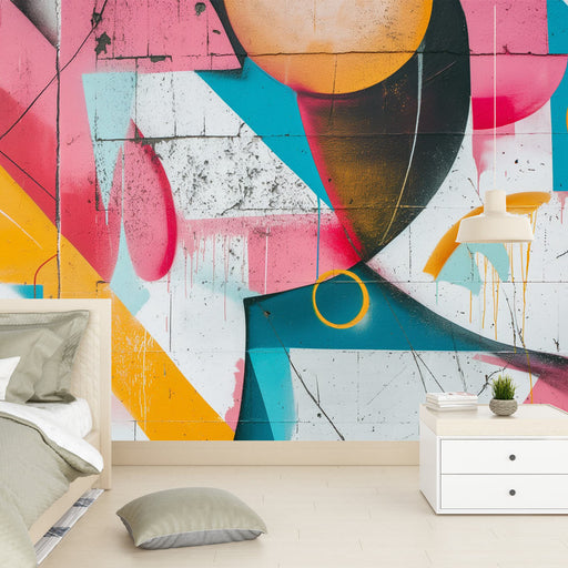 WonderMuralThis graffiti mural wallpaper exudes vibrant energy with its bold lines and splashes of bright colors. Geometric shapes and vivid colors like red, ...