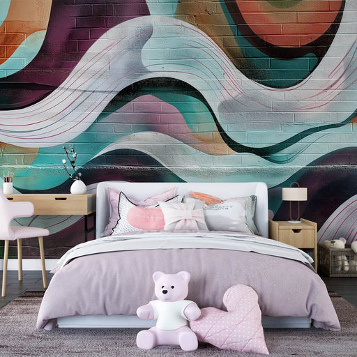 WonderMuralThis mural wallpaper features fluid waves and colorful curves overlapping on a textured brick background. The shades of turquoise, purple, orange, ...
