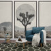 This mural wallpaper features a stunning desert landscape showcasing Joshua trees, characterized by their unique silhouette and striking details, under a calming sky displaying a large circle that evokes the sun or the moon. The soft hues and shades of gray give this design a simultaneously modern and timeless atmosphere.