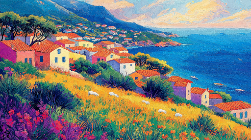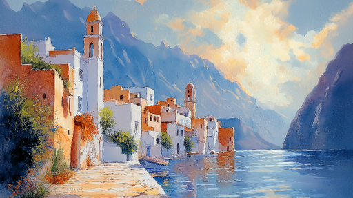 WonderMuralThis mural wallpaper offers a vibrant illustration of a Mediterranean village, nestled between the verdant hills and shimmering waters. The houses ...
