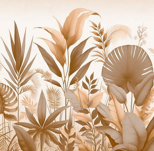 Our wallpaper evokes a tropical landscape with its rich exotic foliage pattern, rendered in a palette of monochromatic colors that brings an elegant touch to any room. The detailed illustrations of palm trees and plants create an atmosphere that is both fresh and soothing, enhanced by a background in delicate tones.