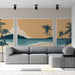 This mural wallpaper evokes a paradisiacal beach immortalized in three parts, showcasing elegant palm trees against a backdrop of warm dawn. The orange and navy blue tones combine to create a serene and relaxing atmosphere, ideal for a contemporary interior.
