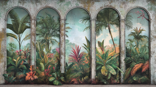 WonderMuralDiscover our captivating mural wallpaper featuring majestic arches framing lush tropical greenery. This vibrant design showcases a variety of lush ...