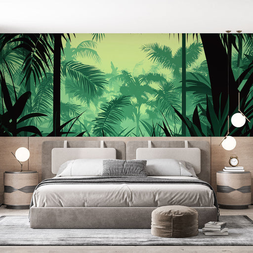 WonderMuralThis mural wallpaper evokes a true dive into a lush jungle, where palm leaves and tropical plants blend to create a soothing and mysterious atmosph...