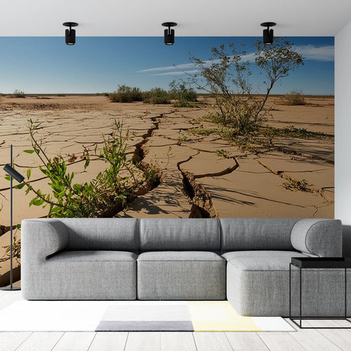 WonderMuralThis mural wallpaper depicts a fascinating arid landscape, where cracks mark a desert floor, interspersed with touches of resilient vegetation. The...