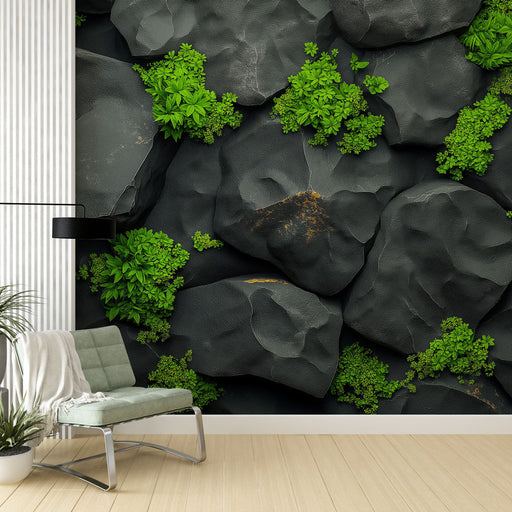 WonderMuralThis mural wallpaper features a captivating pattern of textured black rocks interspersed with vibrant green vegetation, creating a striking contras...
