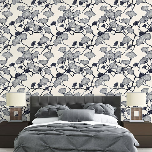 WonderMuralThis spectacular mural wallpaper features a refined pattern of ginkgo leaves, delicately sketched in black on a soft beige background. The harmony ...