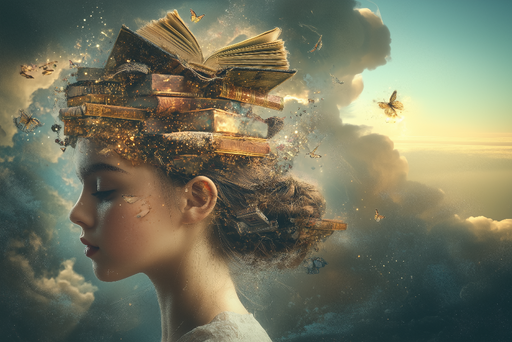 Art'loloExplore the depths of imagination with our imaginary mural wallpaper, featuring a young woman surrounded by floating books and ethereal butterflies...