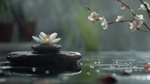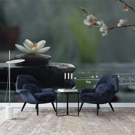 WonderMuralThis captivating mural wallpaper features a serene composition of stacked, lustrous black stones topped with a delicate white lotus flower, all set...