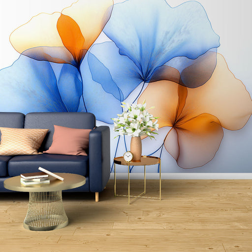 WonderMuralThis delicate mural wallpaper features translucent flowers in soothing shades of blue and orange, creating a light and elegant atmosphere. The fine...