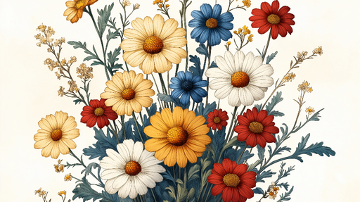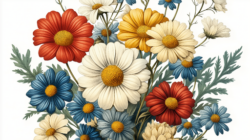 WonderMuralThis mural wallpaper features a magnificent pattern of colorful flowers, an exquisite combination of white, yellow, and red daisies, as well as blu...