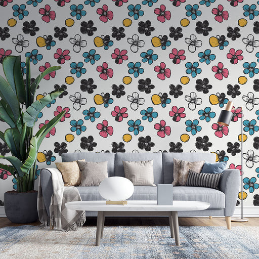 WonderMuralThis captivating Mural Wallpaper showcases a playful motif of multicolored flowers, blending bright shades of pink, blue, yellow, and black. The wh...