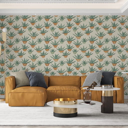 View full detailsMural Wallpaper potted plants | Pattern of green agaves in colorful pots on a light background